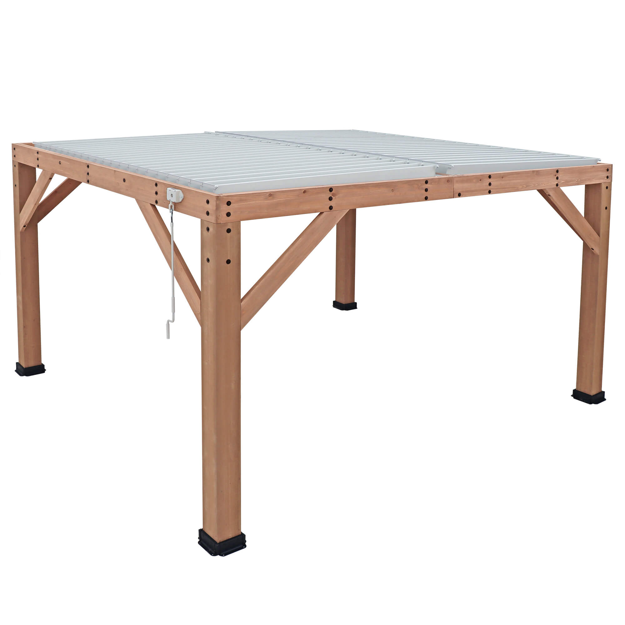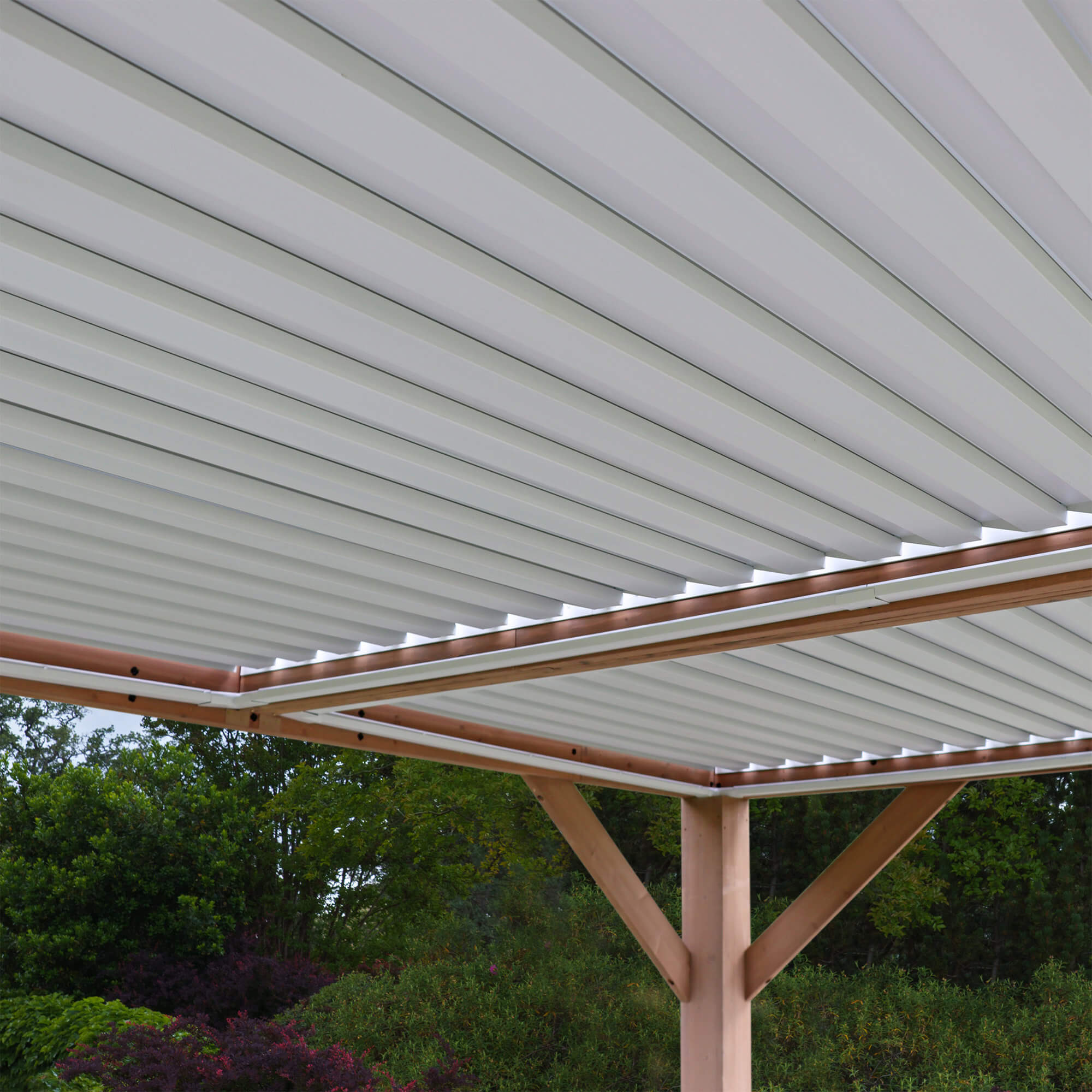 14 x 12 Wood Room With Louvered Roof (SKU: YM12800)The 14’ x 12’ outdoor room with a unique louvered roof will create a unique space in your yard perfect for all kinds of dining, entertaining and socializing. Set up a large dining table to host a dinner or barbecue with all your family and friends or set up an outdoor sofa, coffee table and chairs for a space that invites conversation. The white aluminum louvered roof design allows you to control the amount of sun or shade you receive with a hand crank, two panels allow full sun exposure, full shade, or a mix of both. A gutter system around the roof and two downspouts built directly into two of the posts provide rain protection and proper drainage away from the room. Sturdy, 7 x 7-inch posts with premium black plinths provide a solid foundation without obstructing sightlines. It’s made of 100 percent premium FSC-Certified Cedar lumber, covered in an appealing mocha-brown colored stain that will retain its good looks and withstand the extremes of every season. All wood sections are pre-cut and pre-drilled for easier assembly. This room comes with simple to follow illustrated instructions and we’ve created a helpful hints video to make your installation process easier, as well. The 14’ x 12’ Wood Room with Louvered Roof will give your yard a modern, generously sized entertainment space.