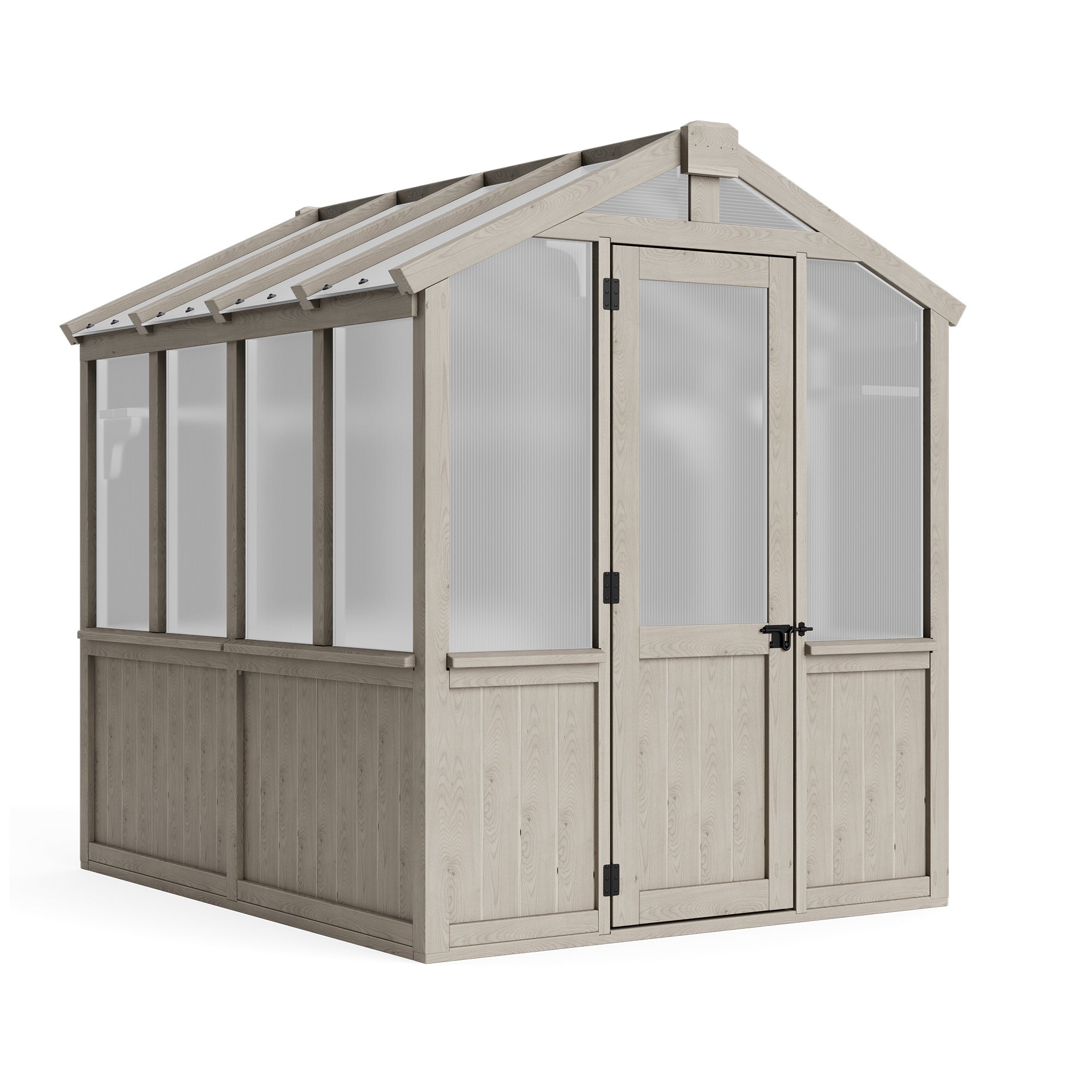 If you're staining a greenhouse, be sure to apply painter's tape around the polycarbonate panels on the door and vent panel to protect them during the staining process.