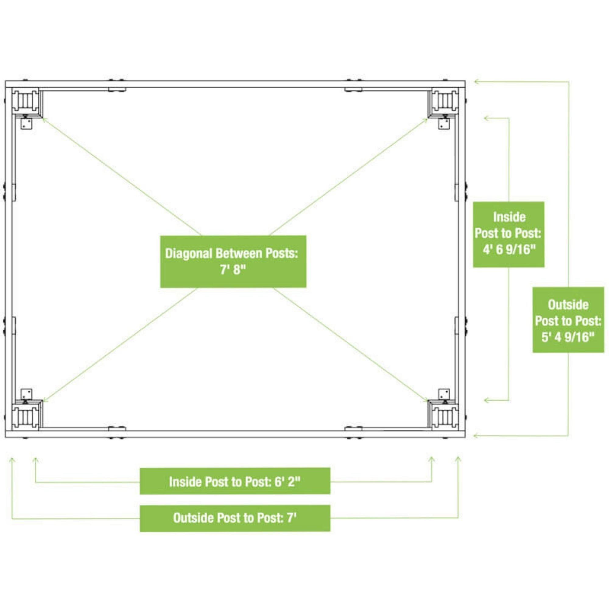 - Base Dimensions (outside to outside of posts): 5’ 9 9/16” L x 7’ W