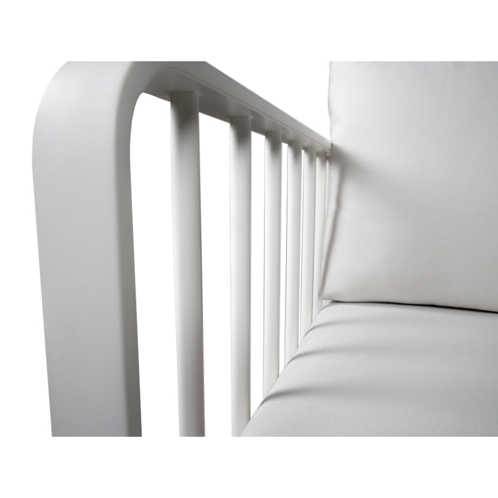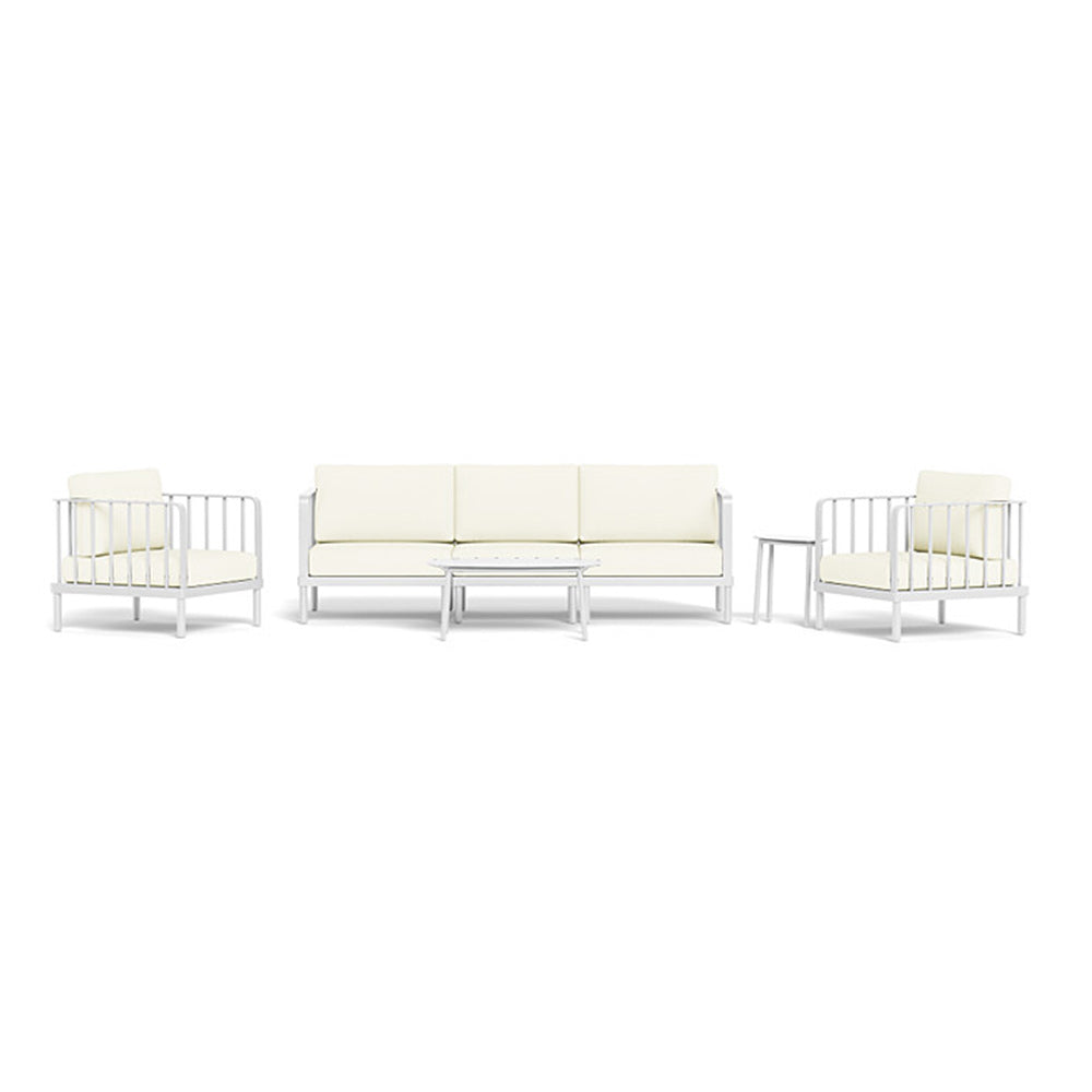 Modernize your outdoor space with Tortuga Outdoor's Morelli Collection. Durable yet airy, every piece in the Morelli Collection is built with aluminum frames featuring a sleek slatted accent design. The cushions upholstered in premium Sunbrella or Agora fabric are fade, stain, and mildew resistant, ensuring beautiful longevity. Configured with convenience in mind, the Morelli Collection 5pc Sofa Set provides seating for 5 accompanied by a Side Table and Coffee Table perfect for any outdoor setting. The Morelli Sofa and Club Chairs boast a slatted frame that wraps around all three sides, giving off a refined yet inviting aesthetic. Comfort is enhanced with a generously thick 4" seat cushion and plush back pillow.